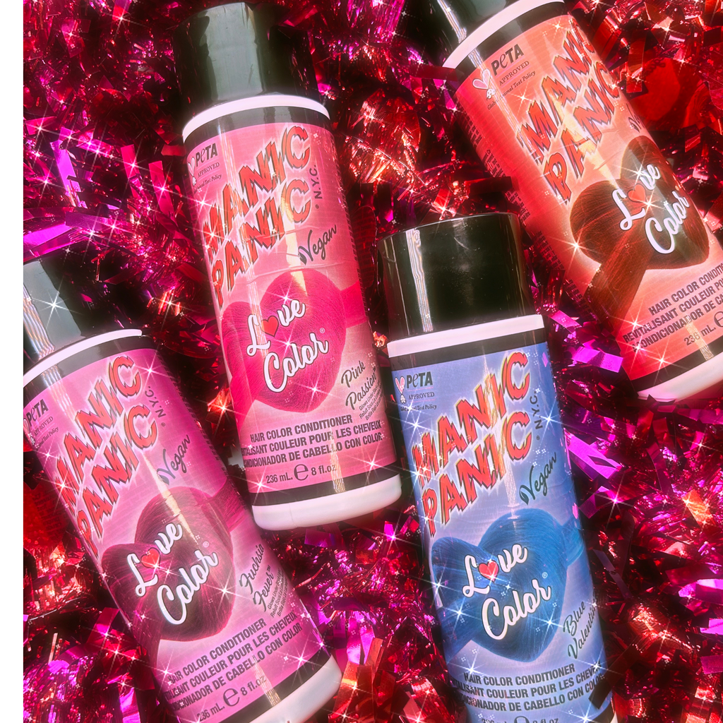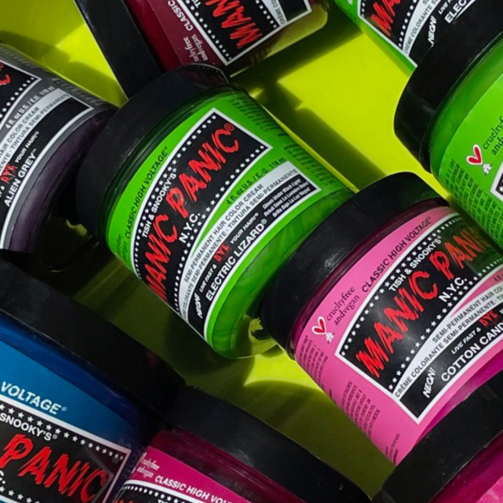 Select Manic Panic shades will produce a glow effect when under UV blacklight on when applied to a platinum blonde hair.